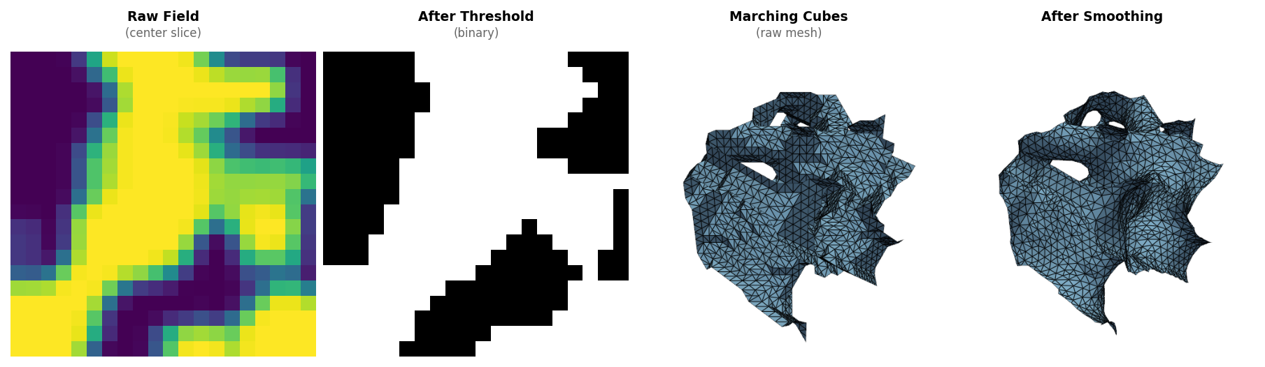 - Smooths the result — Taubin or bilateral filtering to remove staircase artifacts