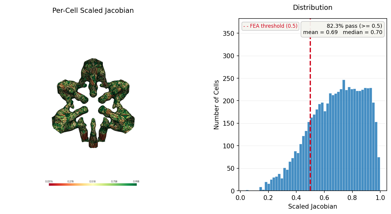 | Scaled Jacobian | > 0.5 | Measures element distortion. Higher is better (1.0 = ideal) |